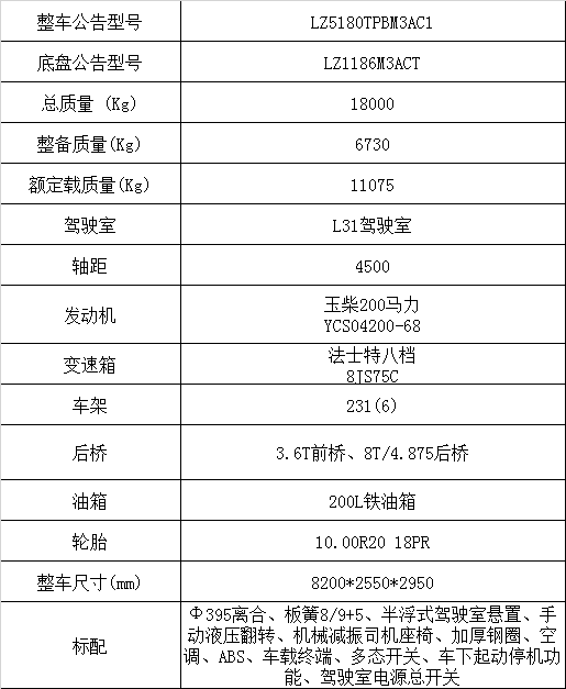 半浮式駕駛室懸置,發(fā)動機YCS04200-68,3.6T前橋、8T/4.875后橋,8JS75C,板簧8/9+5,231(6)局部加強車架,200L油箱,10.00R20,手動液壓翻轉(zhuǎn)、夾層玻璃、電動玻璃升降器、機械減震司機座椅、空調(diào)、ABS、車載終端,ABS、免維護電池、車下起動停機功能、駕駛室電源總開關(guān)、PTO開關(guān)
