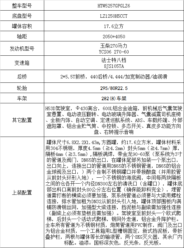 發動機YCS06 270-60,2*5.5T前橋,440后橋/4.444/加寬制動器/油潤滑,8JS105TA,Ф430離合,282(8)車架,600L鋁合金油箱,295/80R22.5,前機械后氣囊駕駛室懸置、電動液壓翻轉、電動玻璃升降器、氣囊減震司機座椅、全新內飾、自動空調、定速巡航系統、ABS、車載終端、外部遮陽罩、鋁合金貯氣筒、中控鎖、多態開關、真皮多功能方向盤、右轉提示音響