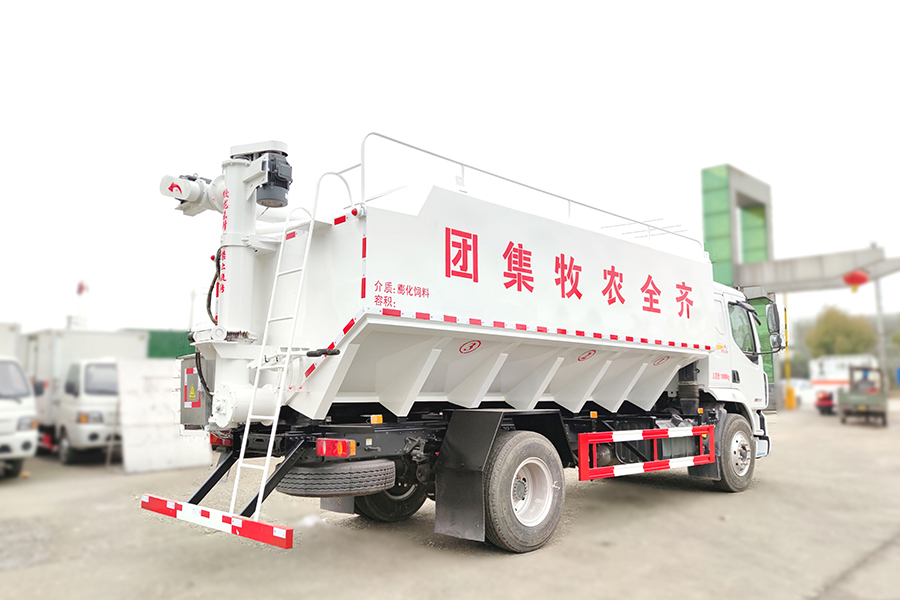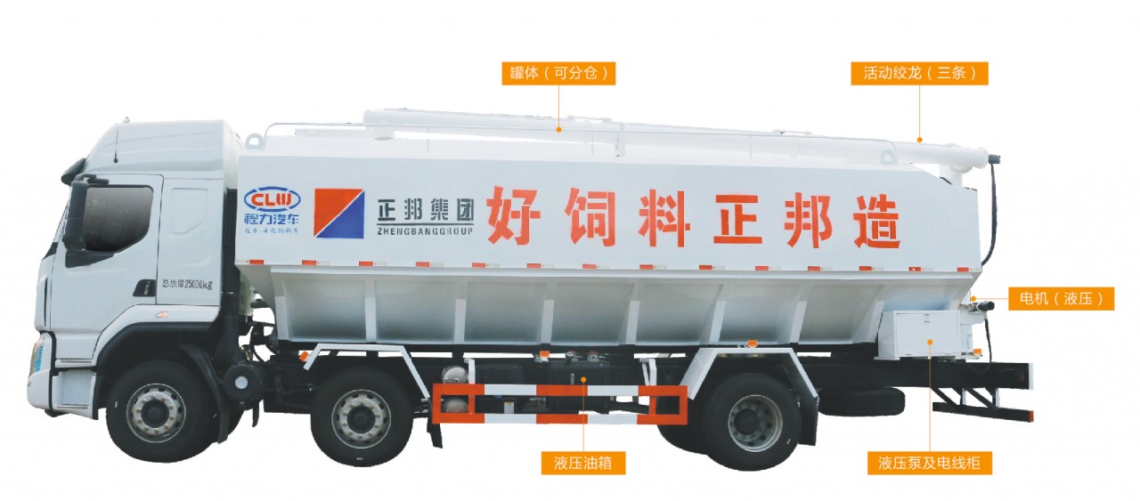 散裝飼料車的飼料罐架設在卡車的底盤上,罐頂開有進料口.頂部的一根螺旋輸送卸料管(俗稱卸料絞龍)則可自由回轉和抬升,抬升的仰角可達60度。運輸時,頂部的螺旋管平臥在罐頂;卸料時則抬起,使管端的出料口與畜禽飼養場貯料罐頂部的進料門相接,駕駛室內裝有操縱裝置(操縱裝置也可裝置在罐體尾部),卸料時通過車底的動力輸出軸和減速器來驅動螺旋,以完成卸料。目前國內主要推出3T、5T、8T、11T、15T和22T等多個噸位車型。